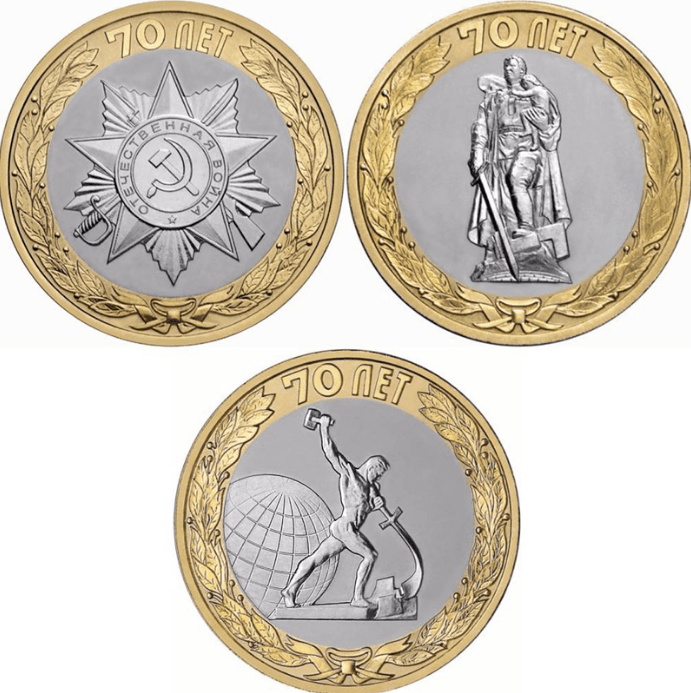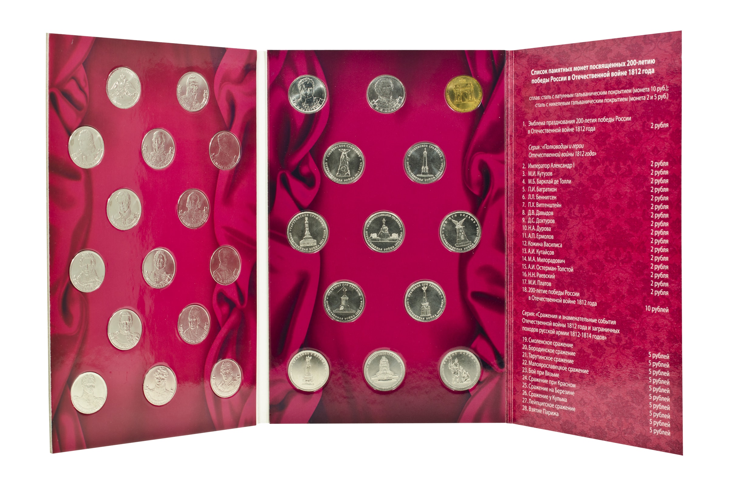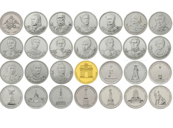 Сражения и знаменательные события Отечественной войны 1812 года и заграничных походов русской армии 1813-1814 годов: Смоленское сражение 5 рублей; Бородинское сражение 5 рублей; Тарутинское сражение 5 рублей; Малоярославецкое сражение 5 рублей ;Бой при Вязьме 5 рублей; Сражение при Красном 5 рублей; Сражение при Березине 5 рублей; Сражение у Кульма 5 рублей; Лейпцигское сражение 5 рублей; Взятие Парижа 5 рублей; 200-летие победы России в войне 1812. Арка 10 рублей.