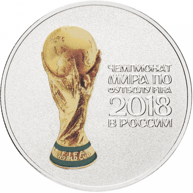 На монете изображен Кубок Чемпионата мира по футболу FIFA в цветном исполнении.